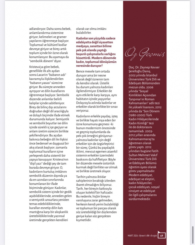 8 Mart Dünya Kadınlar Günü vesilesiyle Merkez Müdürümüz Doç. Dr. Zeynep Kevser Şerefoğlu Danış ile gerçekleştirilen söyleşi, Diyanet Aile Dergisi’nin Mart 2026 sayısında yayımlandı.